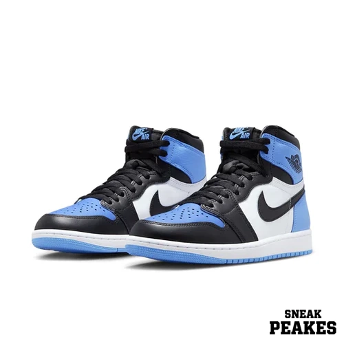 Crafted with premium tumbled leather, the upper features a crisp white mid-panel, deep black overlays, and a bold University Blue toe box that elevates the classic “Black Toe” design. The University Blue heel and ankle add eye-catching contrast, while the black Swoosh, Wings logo, and laces lock in that true OG aesthetic.